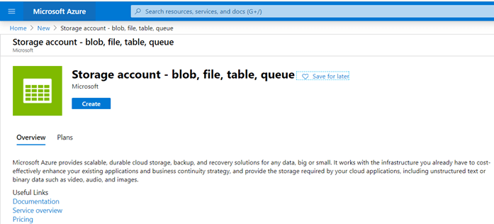 - Para iniciar este recorrido, primeramente, debe ingresar al portal de Azure. Una vez en la página principal, debe seleccionar la opción de “Create a resource” y digite para realizar la búsqueda el texto las palabras “blog storage”. Entre las opciones disponibles, seleccione “Storage account – blob, file, table, queue” y presione el botón de “Create”.
