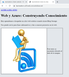 - Ya podemos iniciar a navegar el sitio. Para esto, busque la dirección que copio previamente del punto de entrada primario “Primary endpoint” del paso que mostraba la Figura No.7, este también lo puede localizar nuevamente si así lo requiere, en la sección de la cuenta de almacenamiento llamada “Web Static”. Coloque la dirección en el navegador de su preferencia y debería verse similar a la siguiente figura:
