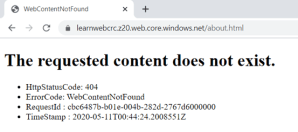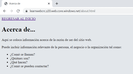 - Si presiona la navegación a la opción “ACERCA DEL SITIO”, se le va a generar un error como el que muestra a continuación, esto porque no hemos aún subido al sitio la página para el manejo de errores: