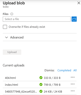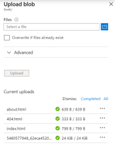 - En el paso correspondiente a la Figura No.7, indicamos la página de índice como “index.html” y el error como “404.html”, entonces se deben subir los archivos mediante la opción de “Upload”. Tome en cuenta que, para fines de analizar el comportamiento del sitio, debe ir subiendo los archivos conforme se va indicando, no subir todos los archivos al mismo tiempo, en cuyo caso, algunos pasos no darán el comportamiento esperado de los pasos descritos.