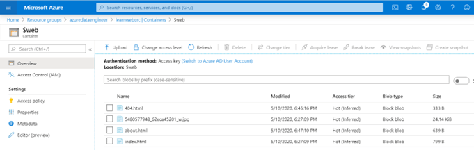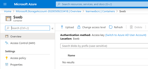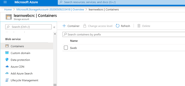 - En esa misma pantalla, navegue en el menú del lado izquierda debajo del submenú de “Blob service” y seleccione “Containers”. Note como en el panel se despliega el container llamado “$web”, el cual corresponde al contenedor para hospedar el sitio web que vamos a darle contenido en los siguientes pasos.