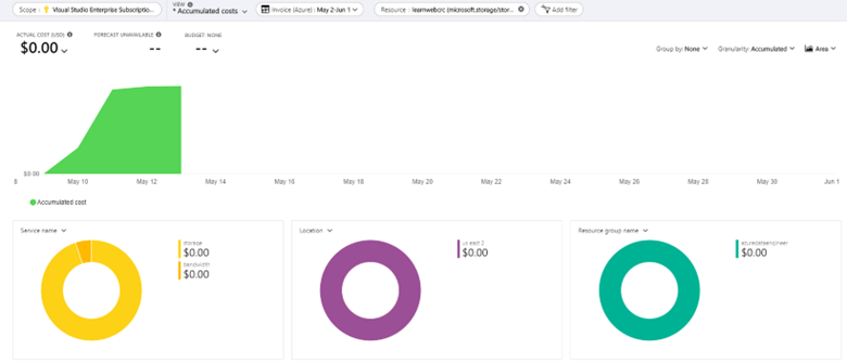 - En cuanto al tema tan importante del costo, en la siguiente imagen se visualizan los gastos incurridos en el almacenamiento de los 4 recursos que componen nuestro sitio web de prueba, después de tres días de hecha la publicación de sitio web construido: