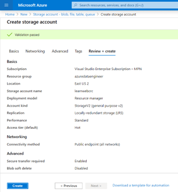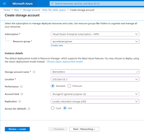 - Para la creación del recurso en Azure, seleccione la subscripción en la cual planea crear la aplicación, así como el contenedor del grupo de recursos, o puede crear uno nuevo si así lo prefiere. También debe ingresar el nombre de la cuenta de almacenamiento y la localización geográfica. De momento la opción de “Performance” puede quedar predeterminada en “Standard”, lo cual significa que el almacenamiento se dará en discos magnéticos, que implican un costo más bajo al Premium, que son discos en estado sólido. El “Account kind” con valor predeterminando de “Storage V2”, indica que el almacenamiento provee acceso a todos los servicios de Azure de blobs, archivos, tablas, colas y discos. En cuanto a replicación, para este demo vamos a utilizar un esquema local para ahorrar costos por lo que seleccionamos “LRS”. El campo “Access tier”, corresponde a la frecuencia de acceso a los datos, en este ejemplo lo vamos a dejar predeterminado en “Hot”, que son de mayor frecuencia que si se marca “Cool”. Presione el botón de “Review + Create”.