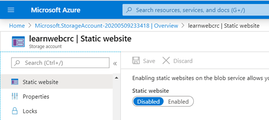 - Sin embargo, a pesar de todas estas posibilidades, de momento nuestro objetivo se centra en el menú del lado izquierdo, debajo del submenú de “Settings”, en la opción que dice “Static website”. Debe navegar hasta esta opción tal y como se muestra en la imagen a continuación. Note que una vez adentro, existe un mecanismo para habilitar un sitio estático. Se dice estático en el sentido que permite contenidos estáticos y scripts del lado del cliente, no del lado del servidor. La selección de “Enable” le crea un contenedor predeterminado a la cuenta para permitir servir como punto de hospedaje en la web.
