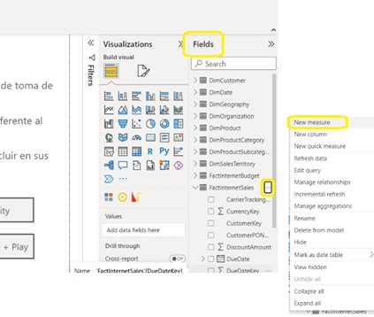 Por otra parte, cuando hablamos de medidas, estas son creadas desde el panel de “Fields” o “Campos” ubicado al lado derecho de la aplicación, y donde se habilita la opción de crear nuevas medidas tal y como se muestra en la Figura No.3: