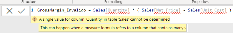 Sin embargo, si colocamos la misma fórmula en el código de una medida de “Sales” obtendremos la siguiente advertencia luego de codificarla, como se muestra a continuación en la Figura No.5: