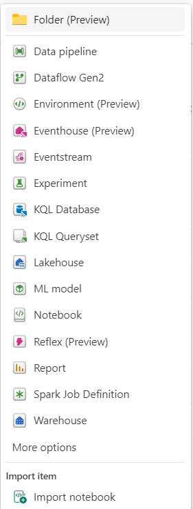 - Artefactos: Son las funcionalidades que se pueden agregar dentro de una experiencia. Los usuarios pueden crear, editar o eliminar estos elementos, que incluyen, por ejemplo, Canalizaciones (Data Pipelines), Cuadernos (Notebooks), Flujos de datos Gen2 (Dataflows Gen2), Informes (Reports), entre otros.